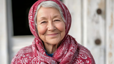 Portrait of a Joyful Senior Woman with a Patterned Headscarf, Radiating Resilience and Happiness