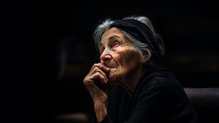 An old woman with wrinkles and a black background, AI