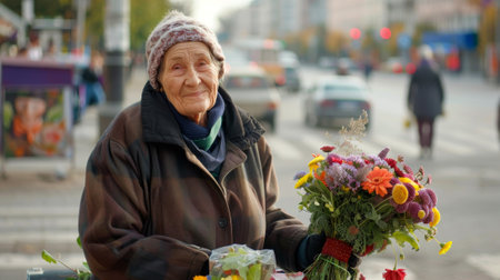 Elderly Caucasian woman selling flowers on a city street. Concept of outdoor market, urban life, small business, senior citizen activity.