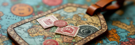 Vintage stamps on luggage tag over antique map background. That the image is generated using AI.