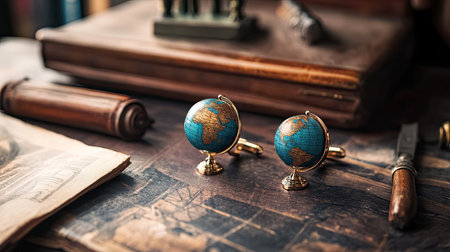 Discover a set of elegant globe cufflinks resting on a rustic wooden table, surrounded by vintage items that evoke a sense of travel and sophistication.