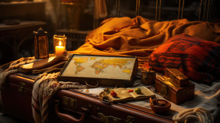 A cozy interior scene featuring a vintage world map, a globe, and an antique suitcase, illuminated by warm light in a beautifully styled room.