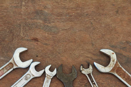 an old rusty wrenches on wooden foreground