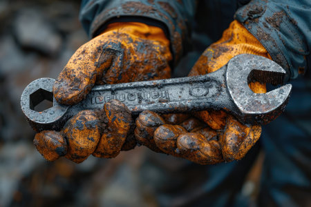 AI Generated. Close up of a rustic metal wrench on dark surface