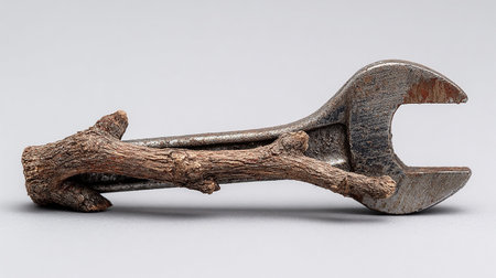 Old rusty spanner on a branch, isolated on a gray background