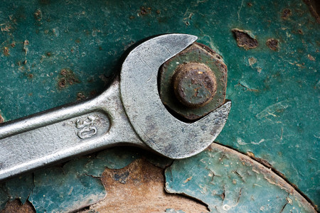 An old spanner on a rusty sheet of metal, close-up, selective focus