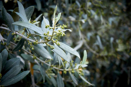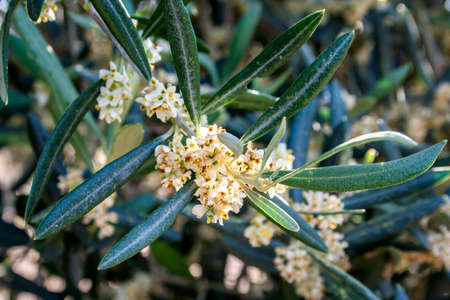 Flowering olive tree branches with buds and flowers. Olive blossoms taken outdoors.
