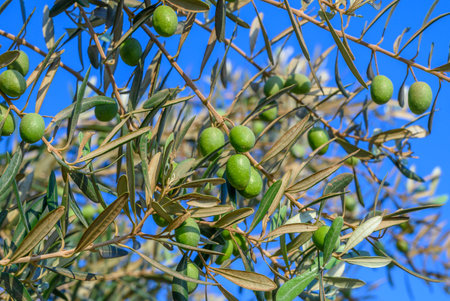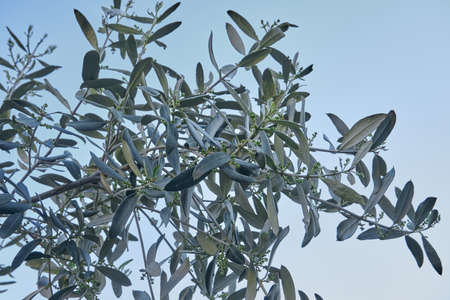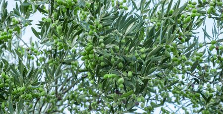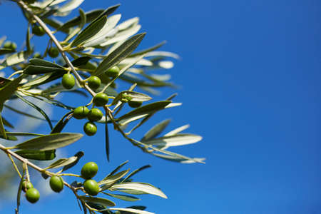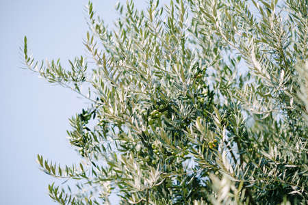 Closeup of a olive branch with leaves and green olives. Olive tree close up in Greece, Corfu, clear sky background.