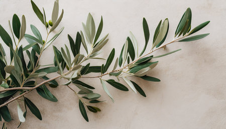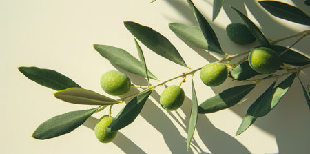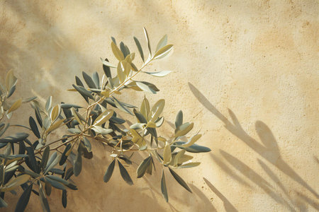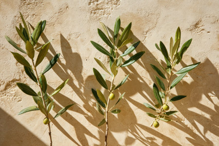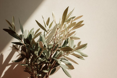 Olive branches in sunlight against a cream wall, casting shadows. Delicate and elegant