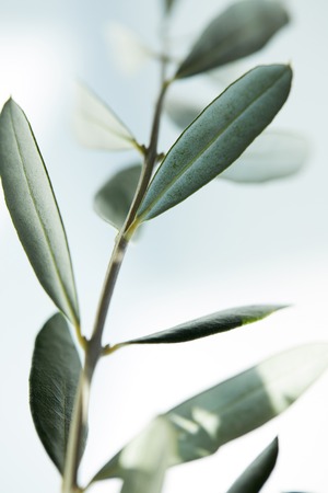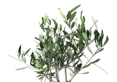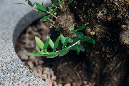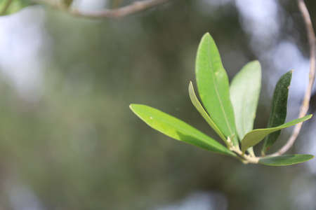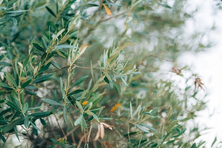 Small shoots of an olive tree. New green branches. Thin long leaves. The tree is recovering after winter.