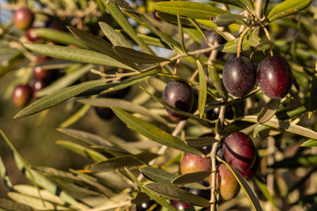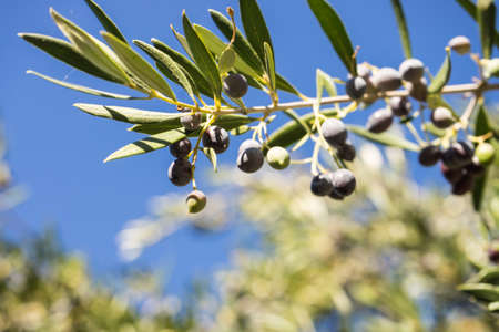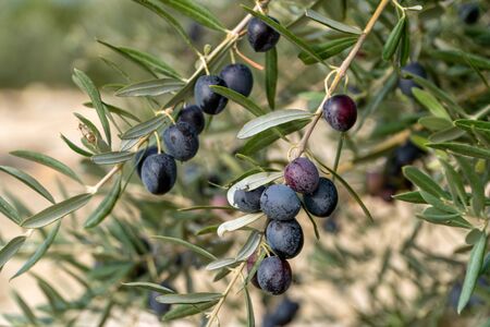 Olives growing on olive tree grove, close up macro view, branch of ripe dark and green olives fruits in a summer sunny day, Ionian sea islands, Corfu, Greece