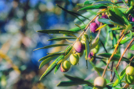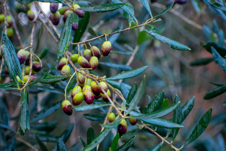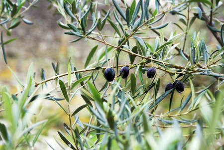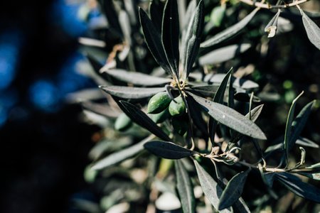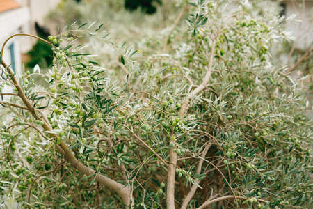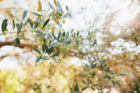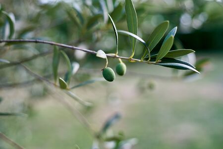 Olive branch with fruits. Olive groves and gardens in Montenegro.