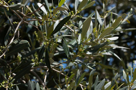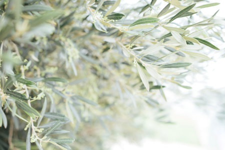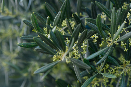 Vibrant olive tree leaves shimmer as delicate buds emerge, heralding the arrival of spring. Nature thrives in this peaceful setting under soft sunlight.