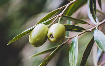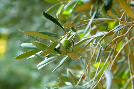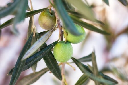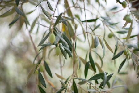 Olives on a branch of an olive tree. Detail close-up of green fruit olives with selective focus and shallow depth of field.