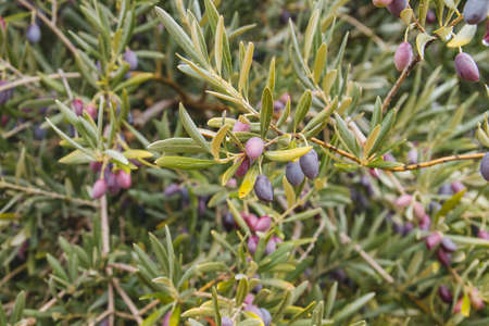 Green tree, bush with growing, ripening dark olives. Mediterranean plants, food concept.
