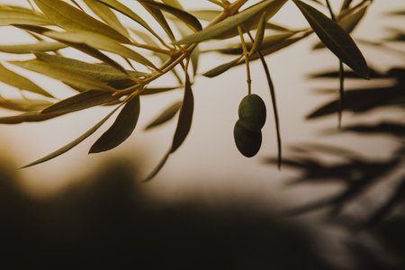 Olive tree branches display lush green leaves, softly illuminated by natural light, creating a peaceful ambiance and showcasing the beauty of nature