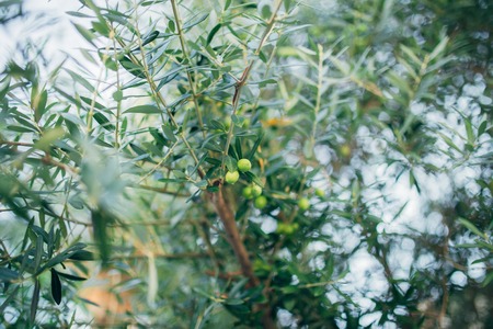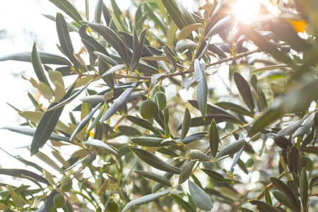 A close-up of green olives on the branches of the tree, a blurred background with the glare of the sun.