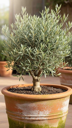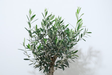 Olive tree in pot. Indoor evergreen potted plant on a light background. Shadow of focus on the wall. House plants