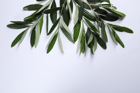 Olive twigs with fresh green leaves on white background, flat lay. Space for text