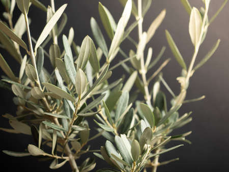 Closeup if silver leaves and branches of olive tree. Detail of Olea europaea plant againts beige wall. Empty copy space, no people. Natural Mediterranean background.