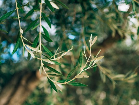 Olive branch with leaves close-up. Olive groves and gardens in Montenegro.