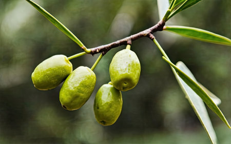 some green olives on a branch with leaves and branches in the background is blurry, but there is no image