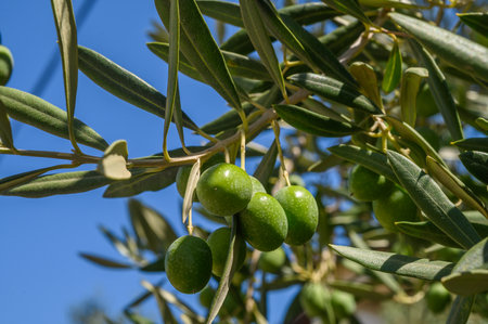 Olive branch adorned with ripe olives set against a bright blue sky, highlighting lush green foliage and the essence of nature's bounty, AI generated