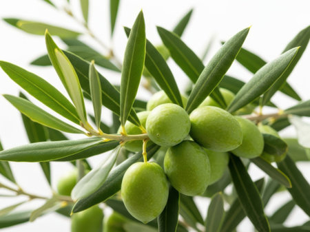 This image features a close-up of a branch with green olives and leaves, isolated on a white background. The olives are fresh and vibrant, showcasing their natural green color. The branch is adorned with elongated, glossy leaves, creating a visually appealing contrast against the bright white background. Ideal for use in culinary, botanical, or nature-themed contexts.