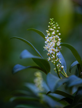 Macro shot of a blossom of the cherry laurel Laurocerasus with buds and leaves