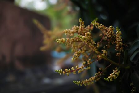 Mango blossoms on the mango tree. The flowers bloom before the mango fruit matures.