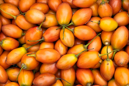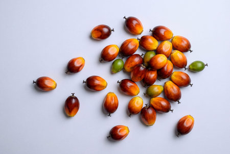 Fresh raw oil palm fruits scattered on a white surface display vibrant red orange and green colors for agricultural and global biofuel industry production concepts.