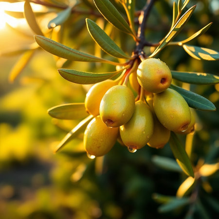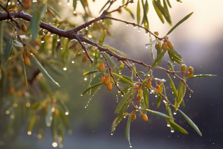 olive tree branches with dew drops in morning, created with generative ai
