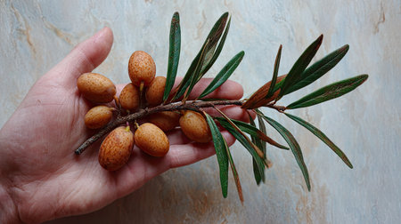 A hand holds a branch featuring small, oval berries alongside green leaves. The composition is simple, with neutral tones highlighting the natural elements. Soft lighting and close-up perspective draw attention to texture and form. Suitable for commercial applications, including editorial or educational content.