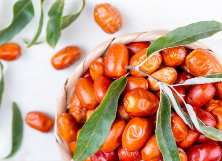 The white background showcases the vibrant colors of the Leaf angustifolia fruit. Traditional medicine benefits from Elaeagnus angustifolia as a key ingredient. Honey plants attract bees