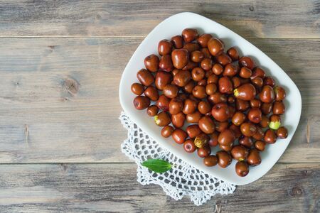 Jujube fruits ( Ziziphus jujuba ) on white plate on rustic background. Free space for text