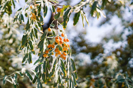 Sea buckthorn berries on a branch in the rays of the setting sun