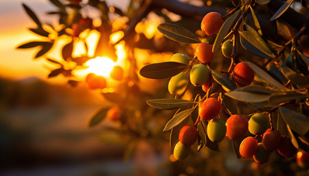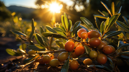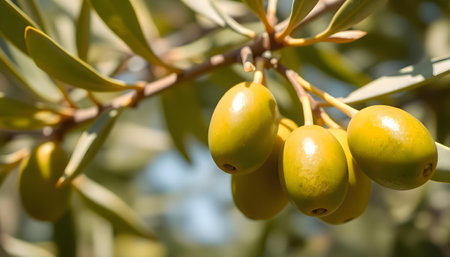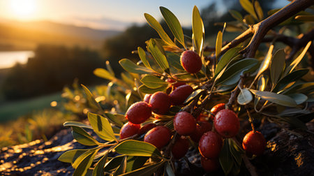 close-up of ripe olives on tree branch in sunlight, created with generative ai