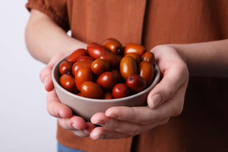 Woman holding bowl with fresh Ziziphus jujuba fruits on light background, closeup