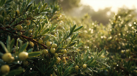 A panoramic wide view of Juniper berry field growing closely together in a dewy morning shining droplets on leaves warm soft daylight ultra realistic photography cinematic wide composition lifelike natural scene