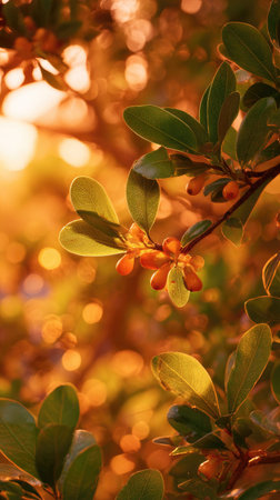 The Acerola at sunset, Golden red sunset light filters through the leaves, still atmosphere, warm orange glow blending with natural green