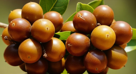 Three glossy brown fruits with green leaves on a light background.