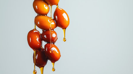 Palm oil seeds with dripping oil captured in motion, bright colors contrasted against a white background.