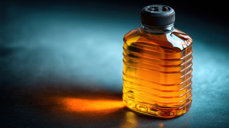 A clear glass bottle filled with amber liquid showcases a dramatic interplay of light and shadows against a dark background.