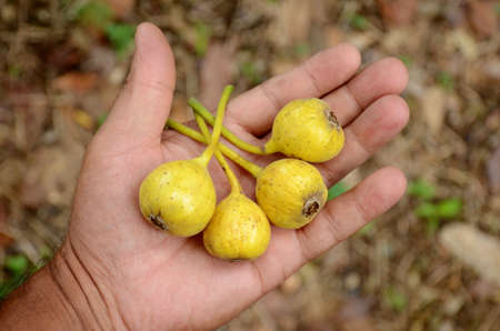 closeup the bunch ripe yellow green tree fruit hold hand over out of focus green brown background.