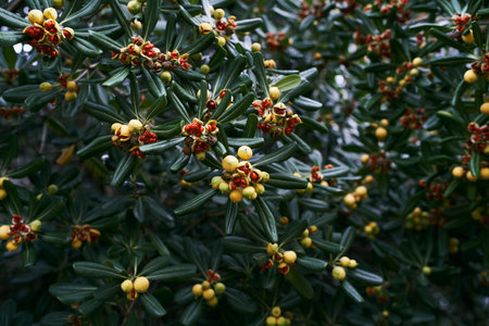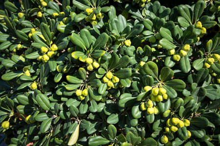A beautiful decorative evergreen shrub with light green fruits. Australian Laurel, Japanese Pittosporum, fake orange, and Japanese cheesewood. Mediterranean shrub. Hedgerow. To form the landscape. Blurred background