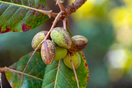 Branch of terminalia catappa or indian almond tree, also known as tropical almond free with nuts close up
