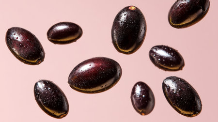 A visually striking image of fresh black olives with glistening water droplets, set against a soft pink background, showcasing vibrant colors and textures ideal for culinary themes.