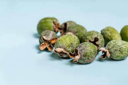 Feijoas lie on a blue isolated background