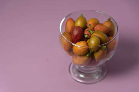 Caferana fruits (Bunchosia armeniaca) in natura served in a bowl on a pink background. Native plant from Brazil. Fruits of medicinal trees, Exotic fruit. Native plant of the Atlantic Forest.