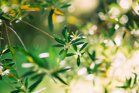 Olive branches against sunlight. Close up view with bokeh.